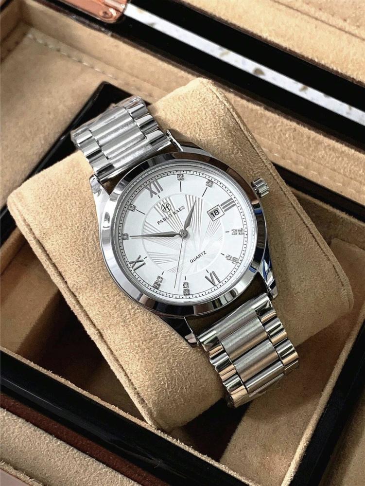 أضف لمسة من الفخامة والأناقة إلى إطلالتك مع هذه الساعة المميزة المصنوعة من الفولاذ المقاوم للصدأ. تتميز بميناء أبيض فاخر مزود بأرقام رومانية وأحجار لامعة تضفي لمسة راقية. يضم التصميم نافذة صغيرة لعرض التاريخ، مما يجعل الساعة عملية وجذابة في الوقت نفسه.